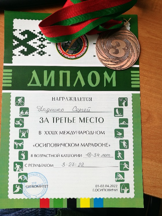 Старший научный сотрудник нашего института Дыдышко Сергей 02.04.2022 г. принял участие в XXXIX Международном «Осиповичском марафоне» (42 195 м) в г. Осиповичи и занял 3 место в своей возрастной категории 18–34 лет. Поздравляем!