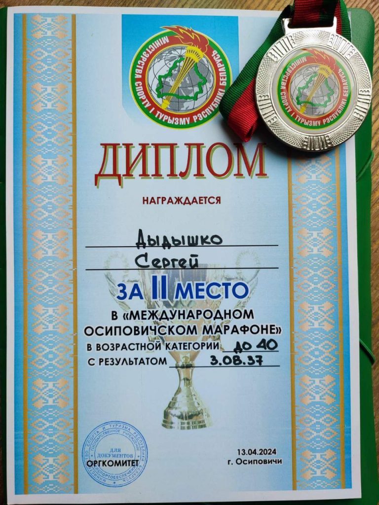 13 апреля 2024 г. ведущий научный сотрудник, кандидат сельскохозяйственных наук сектора агропочвоведения, цифрового картографирования и оценки почв РУП «Институт почвоведения и агрохимии» Дыдышко Сергей Васильевич занял 2 место в возрастной группе до 40 лет на дистанции 42.2 км в 41-м Международном Осиповичском марафоне, посвященному 80-й годовщине освобождения города Осиповичи от немецко-фашистских захватчиков.