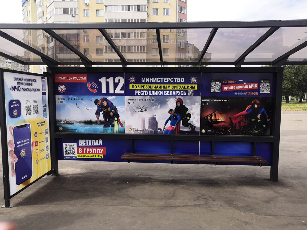 Остановочные пункты для ожидания общественного транспорта получились информативными и полезными. За основу их оформления взяты брэндпакет МЧС «Жизнь – это не кино!» и мобильное приложение «МЧС Беларуси: помощь рядом».