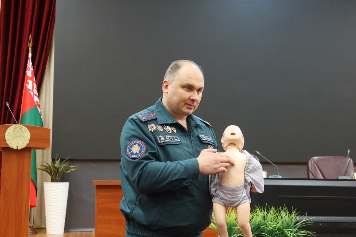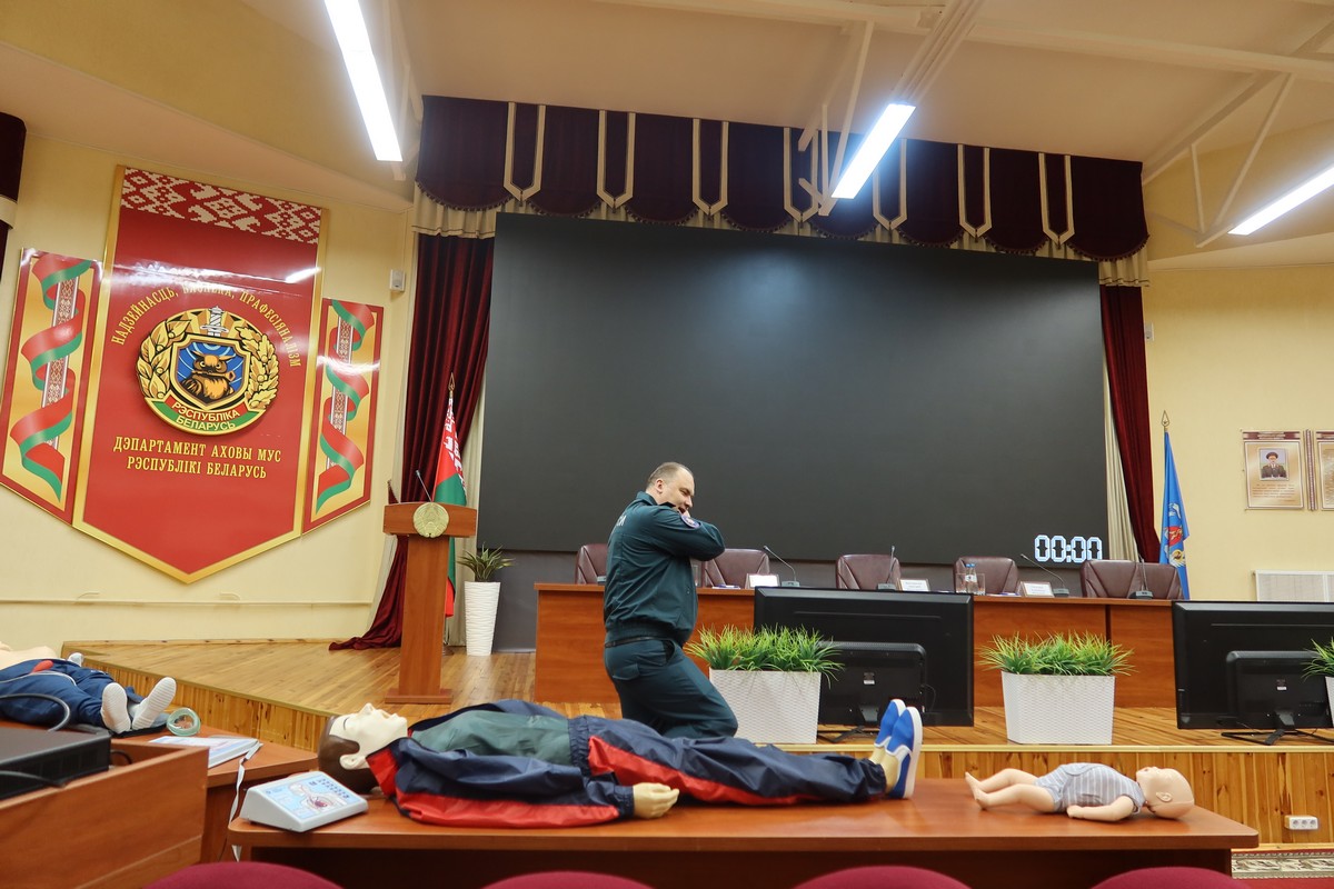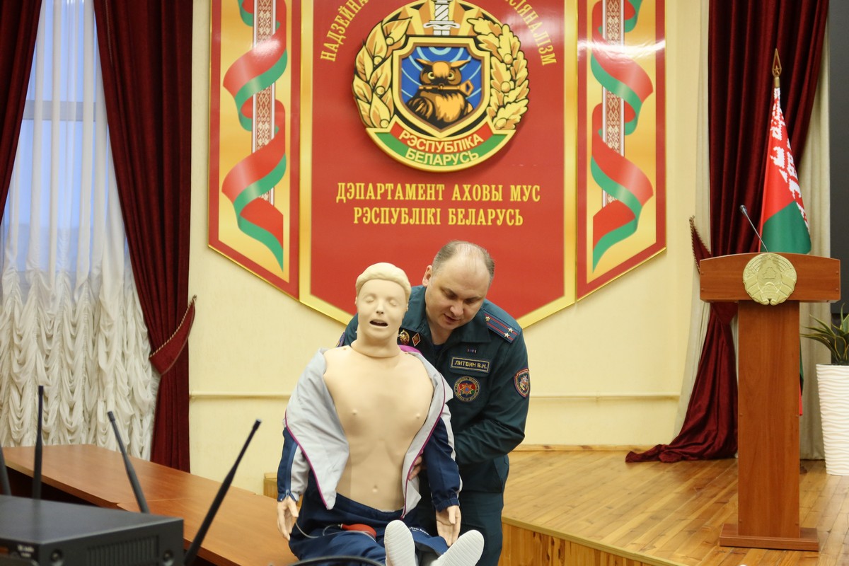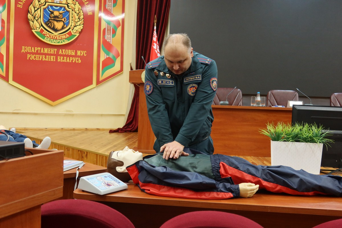 Вопросы оказания первой помощи и проведения сердечно-легочной реанимации осветил и показал наглядно представитель РОСН. При помощи манекенов он подробно остановился на технике проведения, а также указал на детали, на которые следует обратить особое внимание.